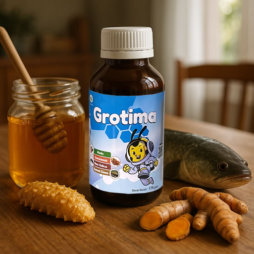 Grotima adalah vitamin herbal anak yang diformulasikan dari bahan-bahan alami seperti madu, temulawak, ikan gabus, dan gamat emas. Kombinasi ini tidak hanya membantu meningkatkan nafsu makan, tapi juga: