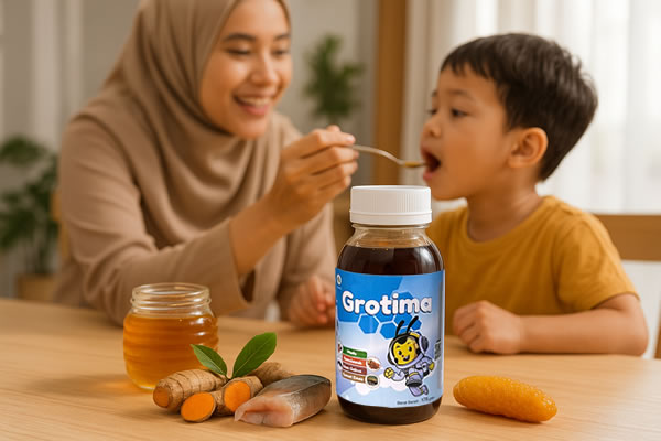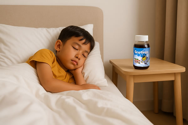 Grotima merupakan suplemen anak yang dirancang untuk mendukung nafsu makan, daya tahan tubuh, dan—pada beberapa kasus—membantu anak yang kesulitan tidur. Salah satu komposisi utama Grotima adalah madu murni yang sudah kita bahas khasiatnya. Selain itu, Grotima juga mengandung bahan lain yang sinergis untuk mengoptimalkan proses tidur anak: